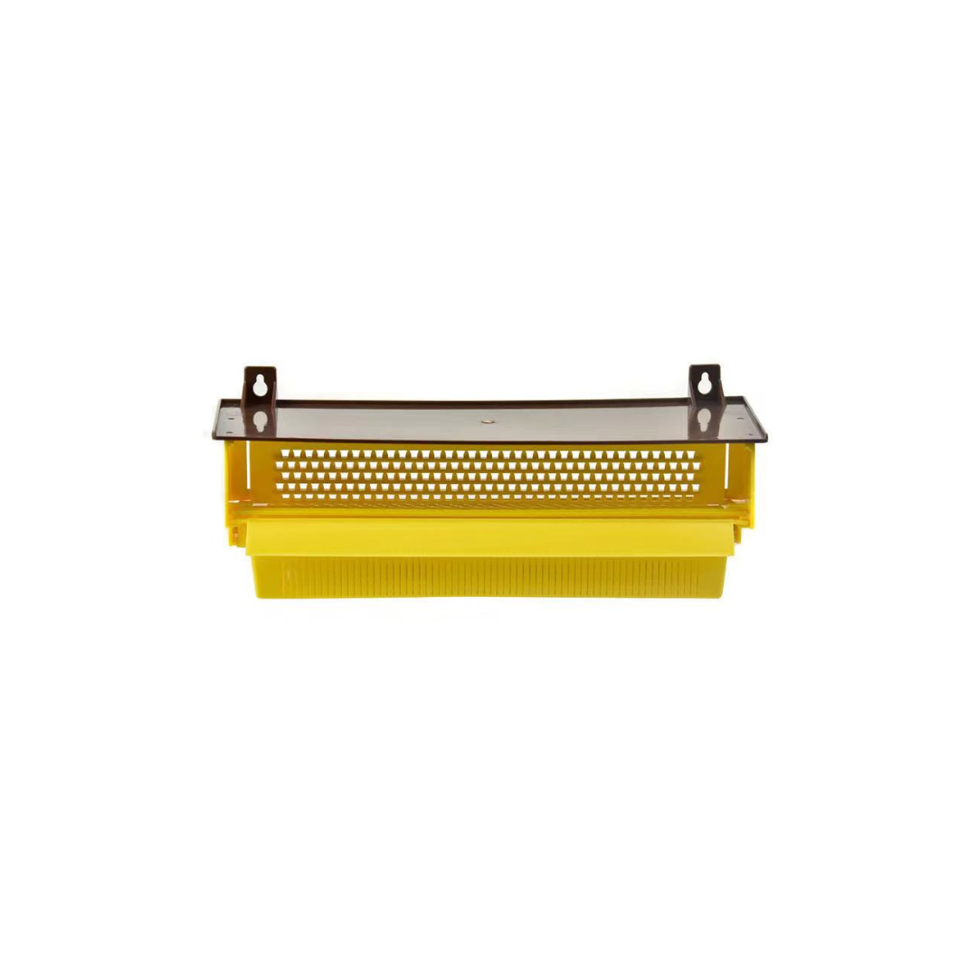Recolector de polen de entrada con cubierta superior, estructura plástica duradera y bandeja removible para facilitar la cosecha.